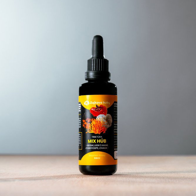 Prírodná tinktúra mix húb zložená z Reishi, Korálovca ježovitého, Chaga sibírskej a Cordyceps sinensis v koncentrácií 20:1 – synergia účinkov na komplexnú podporu imunity, vitality a nervovej sústavy.